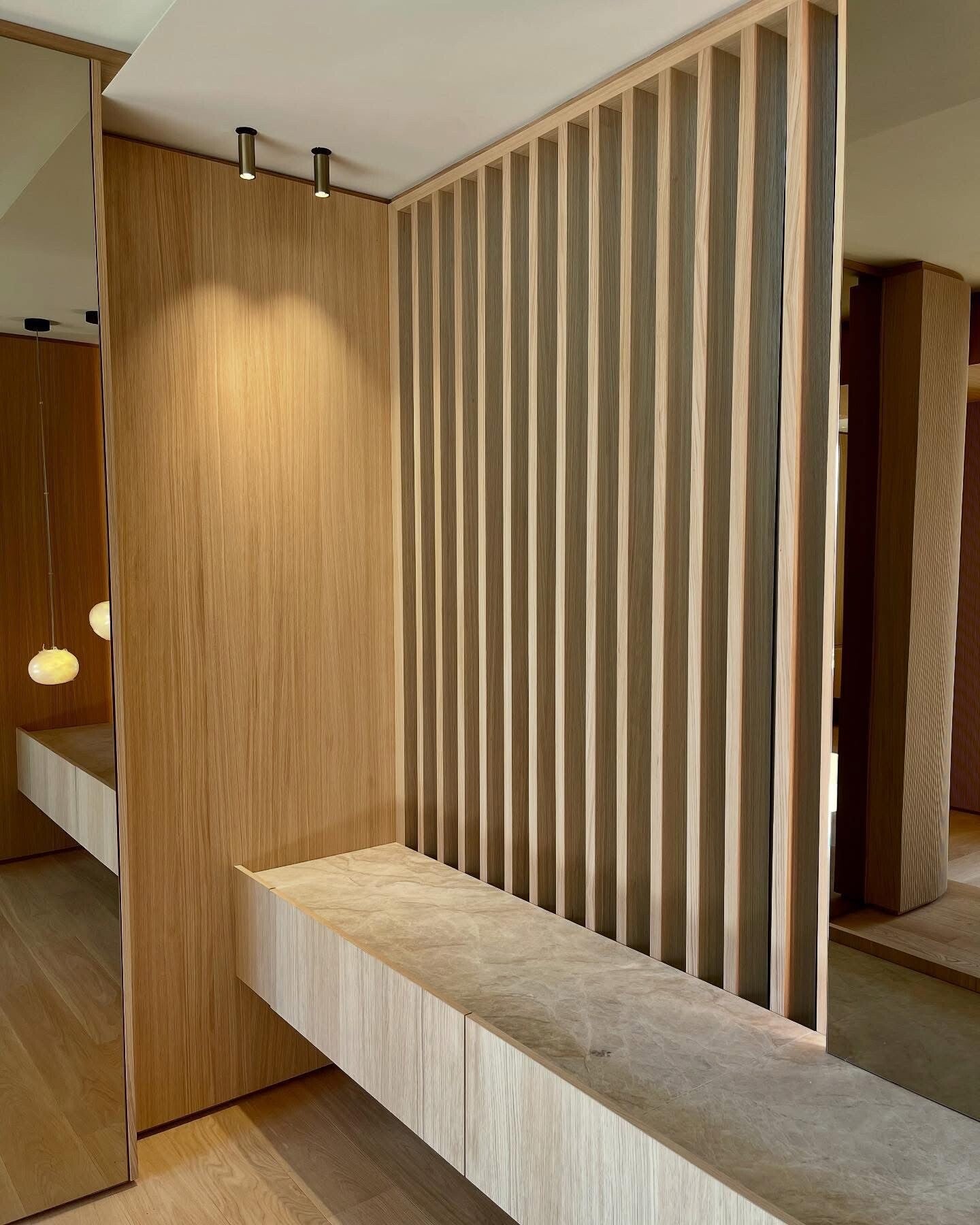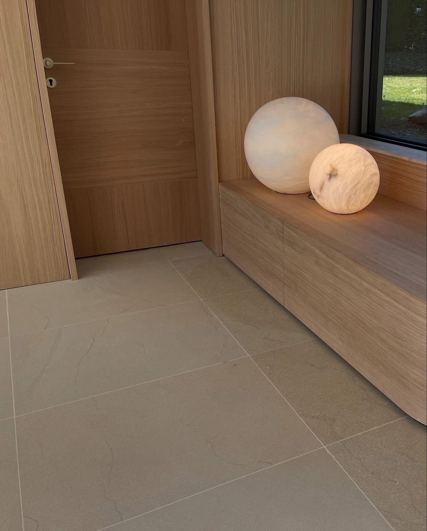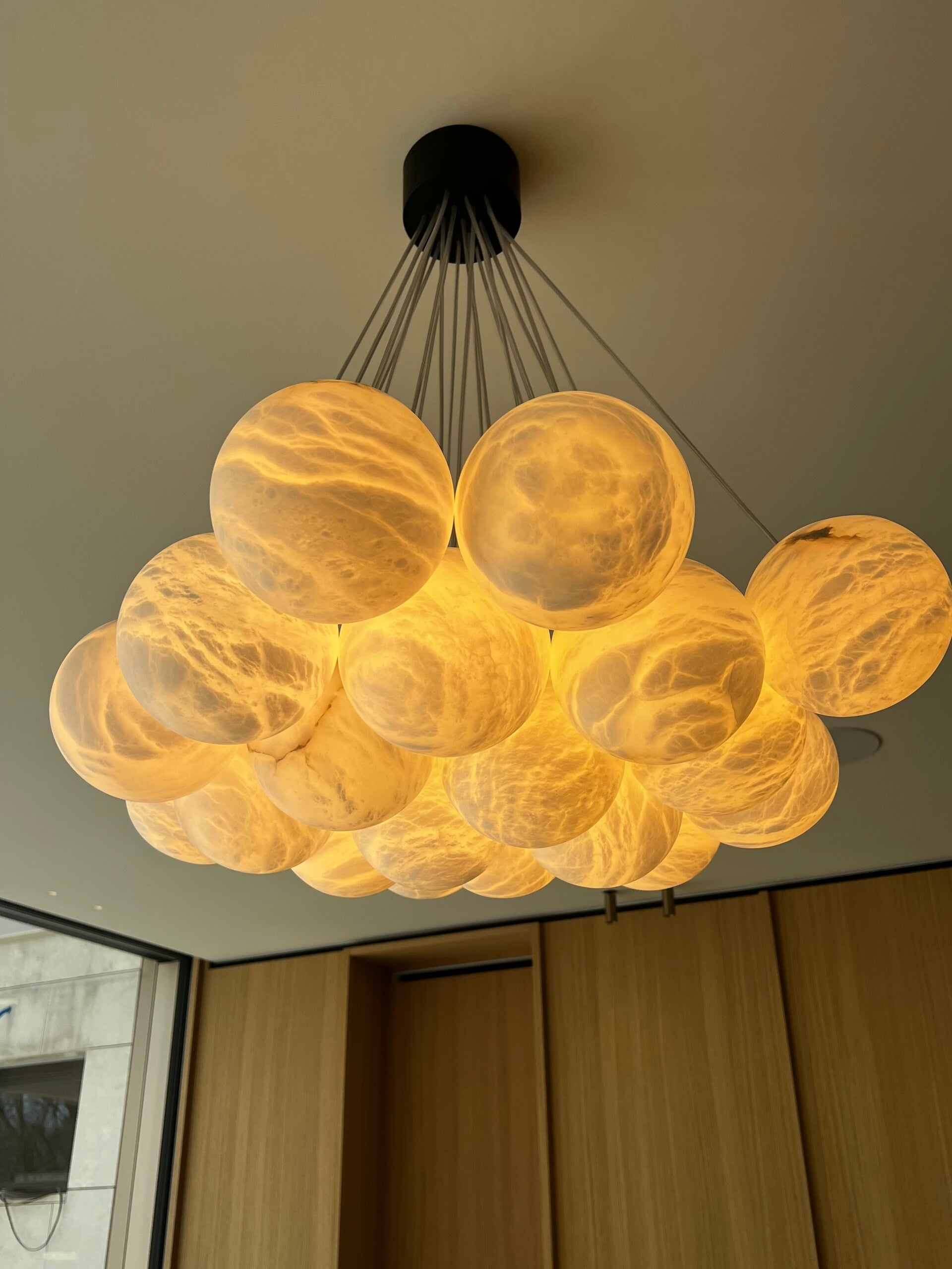 Un travail minutieux a été réalisé autour de la spoterie, alliant spots encastrés pour une discrétion élégante et spots en saillie qui apportent du relief aux plafonds tout en illuminant subtilement les espaces. Cette approche permet à la fois d’assurer un éclairage optimal et de transformer les plafonds en éléments décoratifs à part entière. Des pièces sculpturales, comme de magnifiques suspensions en albâtre, viennent également rythmer les volumes et créer une atmosphère chaleureuse et poétique.